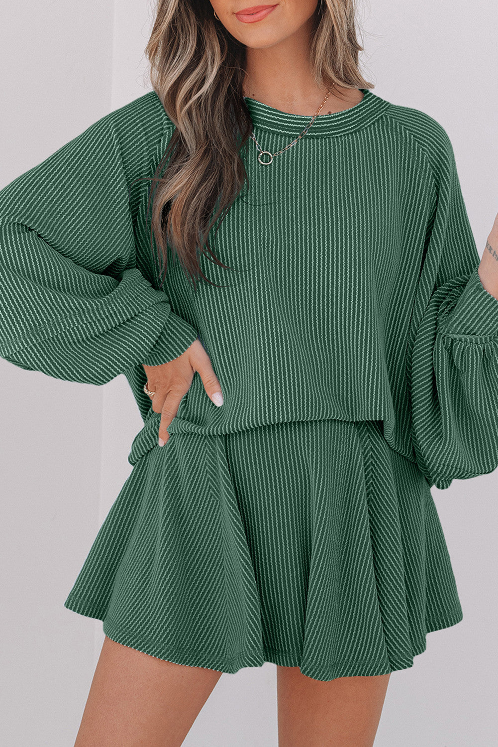 Elevate your style effortlessly with our Corded Skort Set. The unique corded fabric adds texture and visual appeal, while the elegant lantern sleeves make a statement. The high waist design flatters your figure, making it a must-have for any fashion-forward individual.