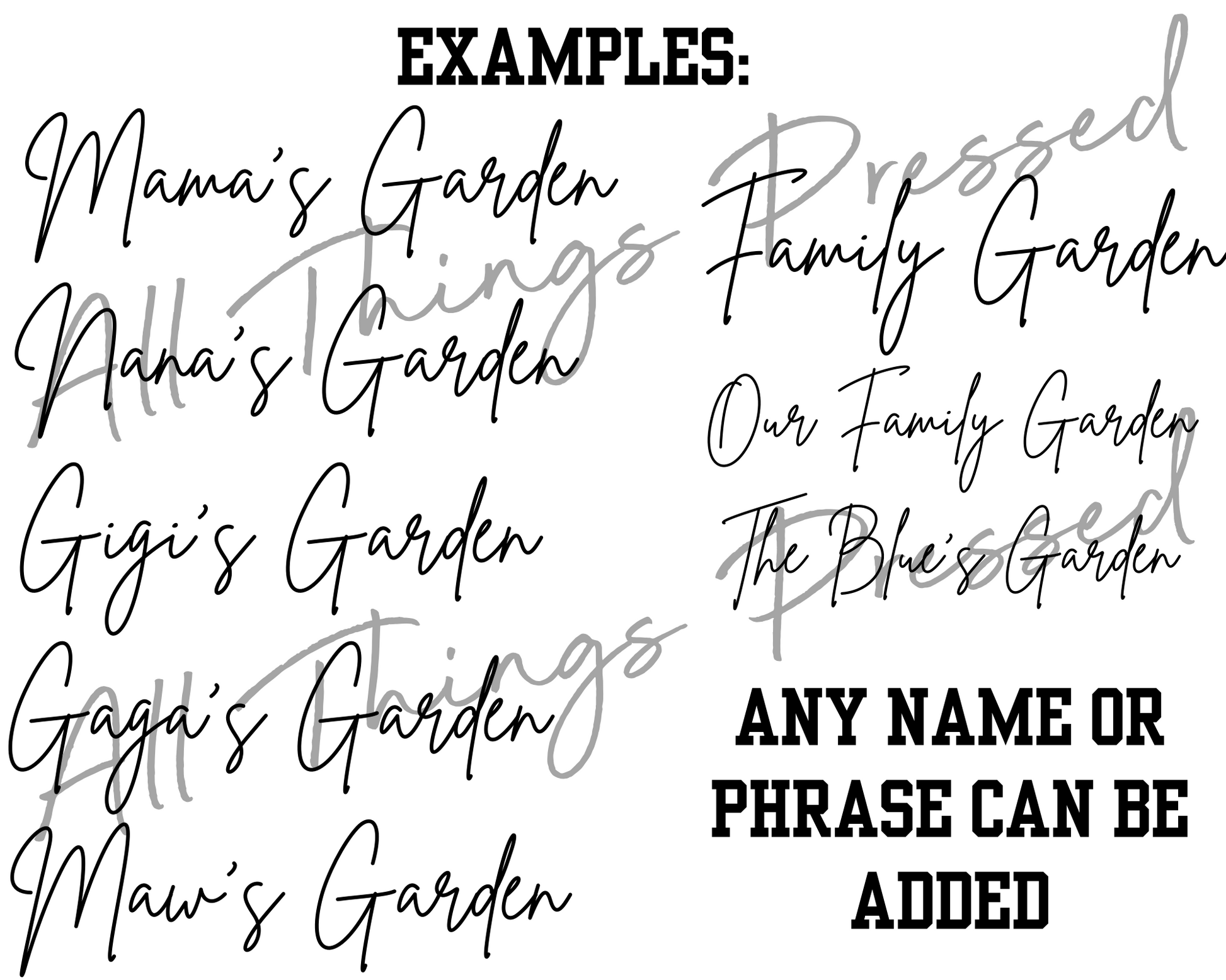 - ADD customization to special order instructions box at checkout. * Birthday month with names and whose Garden.