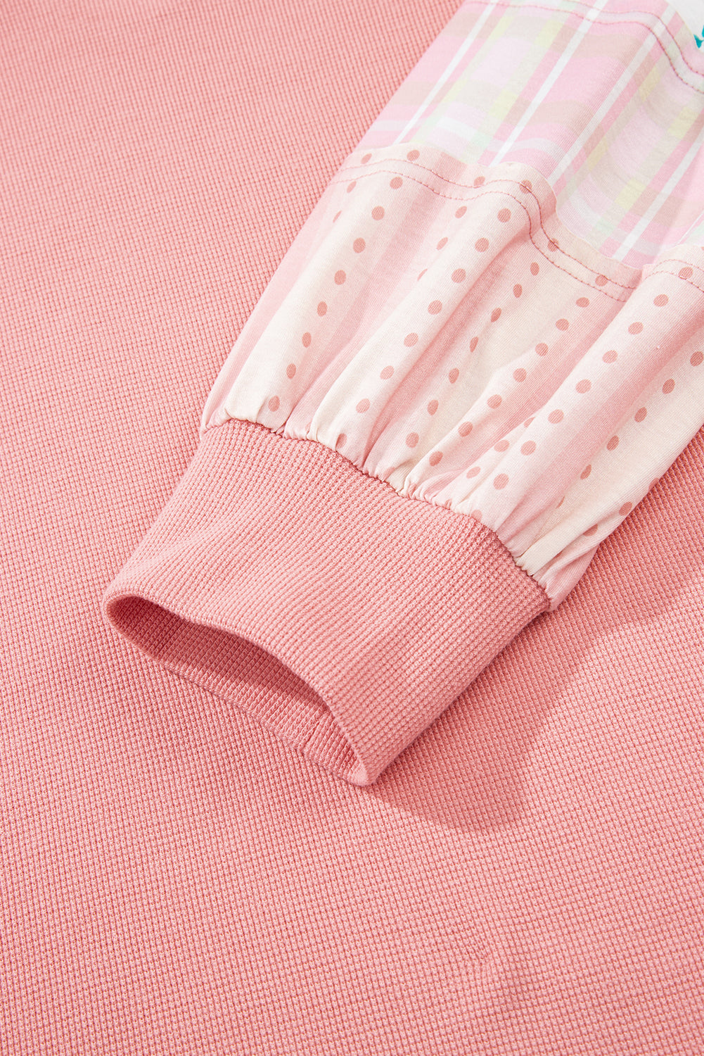 Elevate your wardrobe with this Pink Floral Sleeve Waffle Plus Top. Featuring textured waffle knit fabric, it offers both comfort and quality. The notched V-neck flatters a slim face shape, while the drop shoulder and bubble sleeve design create a relaxed, stylish look. Perfect for adding a playful touch to your everyday outfit.
