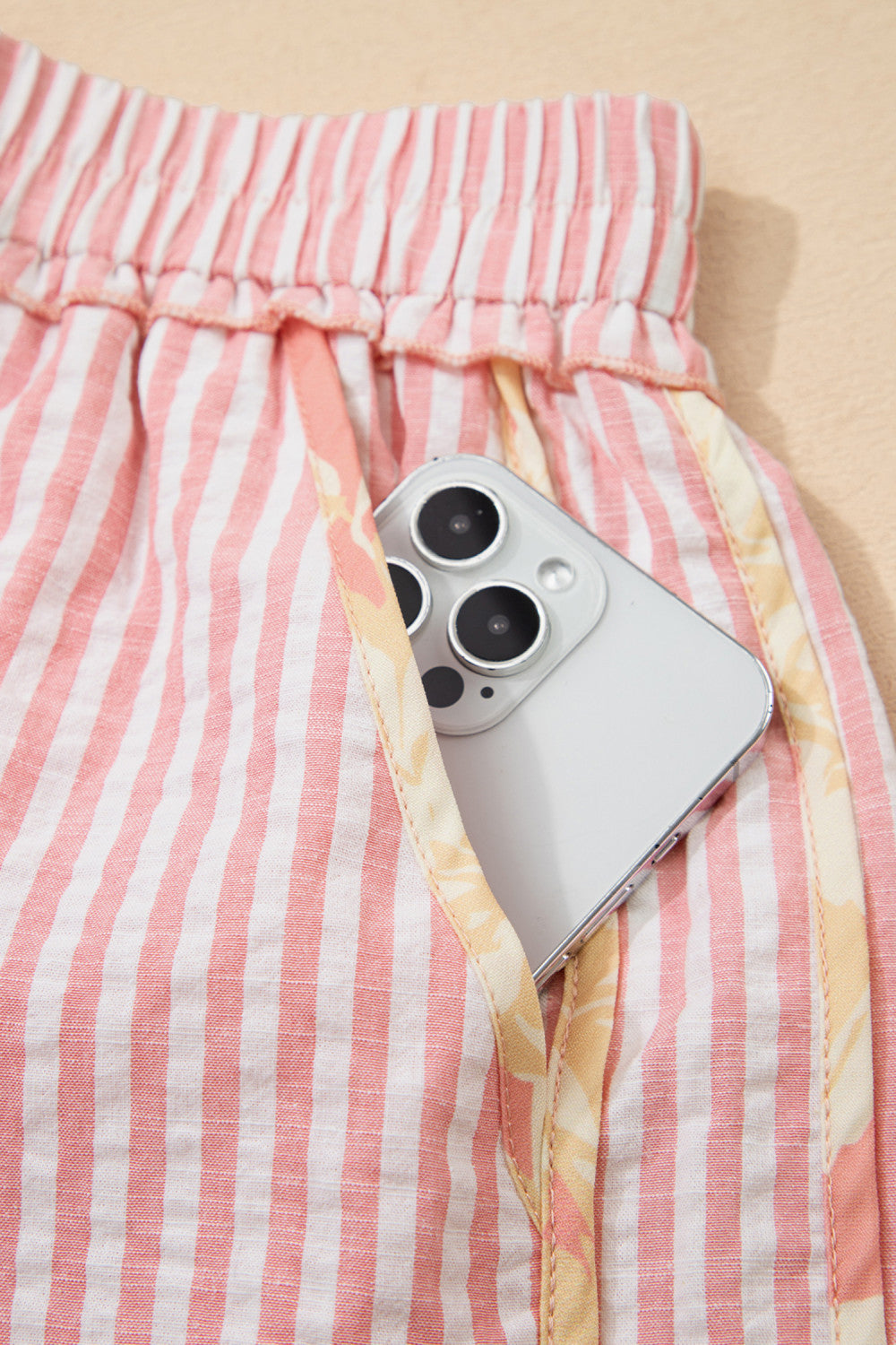 Embrace effortless summer style with these striped casual shorts featuring delicate floral trim that adds a feminine touch to your warm-weather wardrobe. The charming ribbon knot waist provides both visual appeal and adjustable comfort for the perfect fit. Crafted from lightweight fabric, these shorts deliver all-day wearability without sacrificing style, making them an ideal choice for relaxed outings and casual adventures.